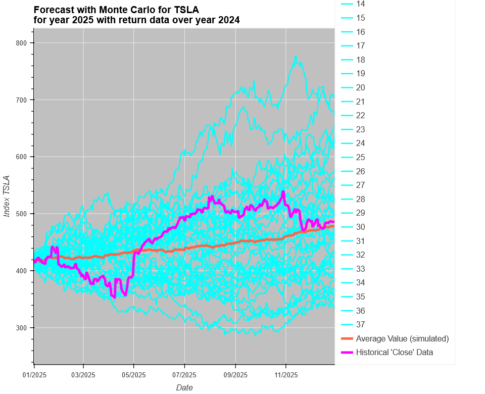 Monte Carlo forecasts Equity Tesla for next year (252 days) based on its daily historical return data over last 12 months. These historical equity data to download from yfinance library
